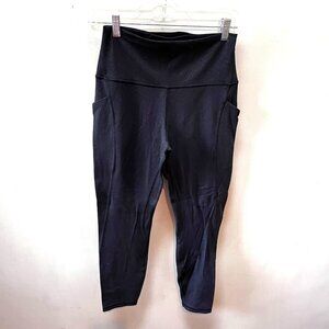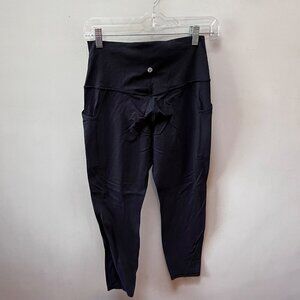 These Lululemon leggings offer both style and functionality with a sleek black design featuring a subtle textured pattern. The high waistband ensures a comfortable fit, while side pockets provide practical storage. Crafted for durability, they're suitable for workouts or casual wear, offering versatility in your wardrobe.