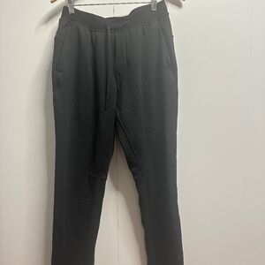 Authentic Lululemon Athletica black jogger sweatpants featuring a soft fleece-lined interior for warmth and comfort. Designed with an elastic waistband and adjustable drawstring, plus a tapered leg for a clean athleisure look. Subtle reflective Lululemon logo on the leg.