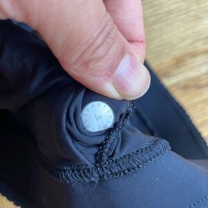 Lululemon black racerback sports bra with a clasp opening at the back. I'm unsure of the style name. The main exterior of the bra is a black mesh. The cups are lined in Luxtreme, so they are opaque even without removablecups. The area between the cups, and the straps, are a moderately transparent mesh. The bra has a clasp opening.