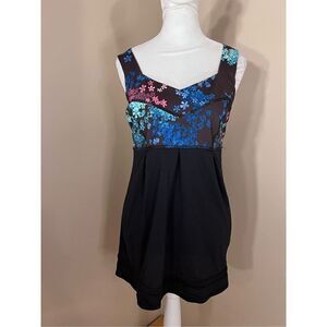 Black tank top with a multi colored floral accents from Lululemon. This is a breezy tank to fit comfortably over your favorite sports bra. (no built in shelf) The loose fitting bodice of this tank is created with breathable Mesh for added airflow when things start to get sweaty. Wide shoulder straps, v neck in the front, and deep scoop in the back. Cinch drawcord in hem.