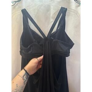 Sleek black athletic tank with a built-in bra for comfortable, supportive wear. Features a strappy back design, smooth lightweight fabric, and breathable mesh paneling at the bra for airflow. Ideal for yoga, pilates, walking, lounging, or everyday athleisure wear.