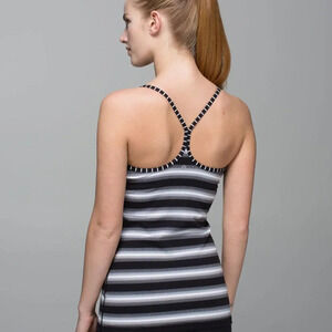 Lululemon, Power Y Tank, women’s tank top, size 6, black and white stripe, Luon fabric, built-in shelf bra, supportive tank, yoga tank, pilates wear, workout top, slim fit, breathable fabric, stylish activewear, comfortable tank, casual top, gym clothing, fitness fashion