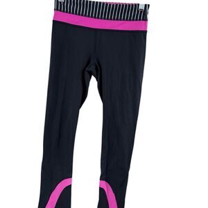 These Lululemon leggings offer a form-fitting design with pink accents. They feature a wide pink waistband for a secure fit and curved panels. There is a box zipper pocket.