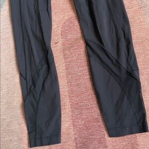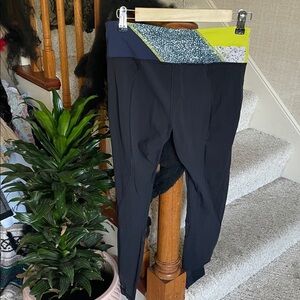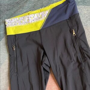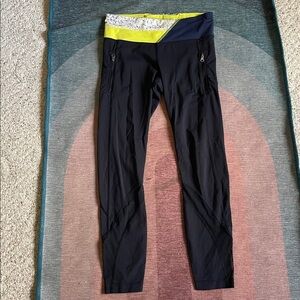 Stylish black leggings with a vibrant yellow colorblock design. Features zippered pockets for convenience. size 6 great pre loved condition