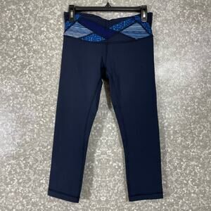 Women's Wunder Under Crop III leggings by Lululemon Athletica. This navy blue legging has a patchwork design at the waist, a capri length, and a low rise. It is a Full On Luon and Lycra blend.