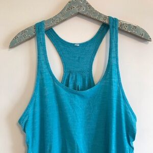 Features: blue tank, relaxed fit, split back. Blue salute the sun tank