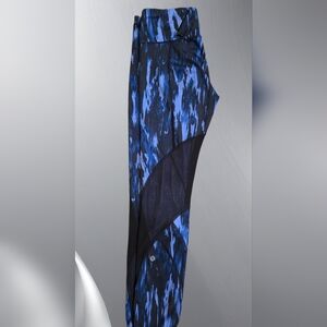 These leggings feature a vibrant electric blue and deep black abstract design, perfect for a bold and energetic look. Made from a performance material with a slight sheen, they are ideal for athletic wear or casual outings. The dynamic pattern adds a modern touch to your wardrobe. Size 6 EUC