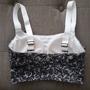 Excellent condition- only worn once! Lace print long line bra with bust cups. Straps can be worn straight or crossing in the back.