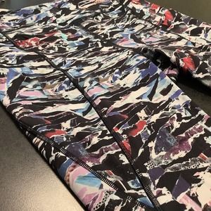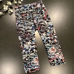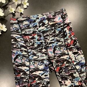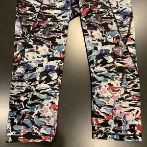 VGUC Lululemon Break Free Crop (Nulex 17’’) leggings in Culture Clash Starlight Black, size 6. Multi color/black print with black serging. Five pockets, two outer side, two inner waistband and one back outer waistband pocket with zip closure. No rip tag. Approximate measurements laid flat: