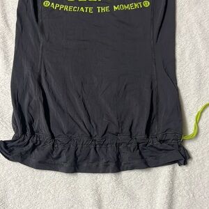 Lululemon limited edition “Breath Deeply” racerback its the perfect top for this summer. Lululemon logos on the front and a back small pocket with another logo on the back. Adjustable waist to make it how you want. Size 4. Made of Spandex, nylon and Lycra. Like a dark grey