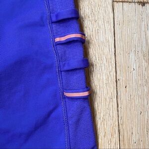 High rise crop with strategically placed mesh panels to keep you cool on a long run. Luxtreme fabric. Reflective detailing on straps along side panel. (Orange details when not reflecting). Two waistband gel pockets in the front of the waistband, large, zippered pocket (can fit an iphone) in the back. A little discoloration on back right hip (see last picture). Otherwise still in great condition. No holes. Smoke free pet free home.
