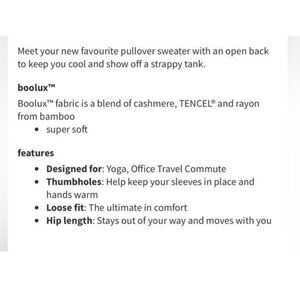 Lululemon Bring it Backbend woman's cashmere blend open back sweater. Sweater is made of a very soft cashmere, rayon, tender blend. No longer has size tag but is measuring a woman’s size 8-10. Please check measurements to ensure fit.