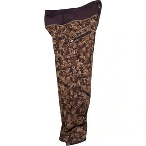 Elevate your activewear with these Lululemon cropped leggings in a bold brown camo print. These leggings feature a wide waistband, a zippered side pocket for essentials, and a cropped length ideal for workouts or casual wear. The dot inside the inner pocket confirms the size as 2.