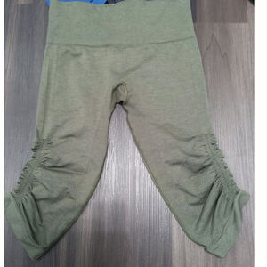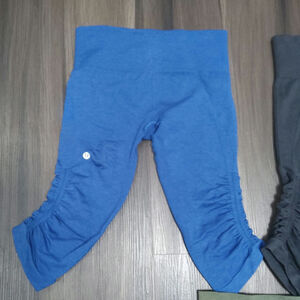 Lululemon athletica flow and go crop leggings with ruching on side for extra give/ support this is a bundle of 3 that are in like new condition, black pair has wear at seam in the crotch area. Size 4/6. Blue pair, olive green, and black. See photos for additional description.