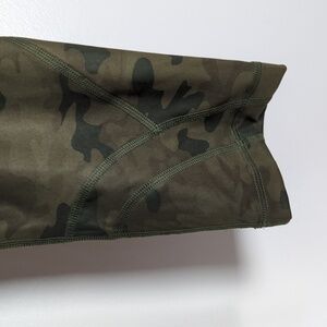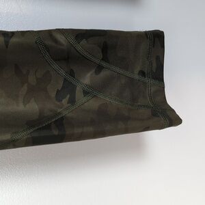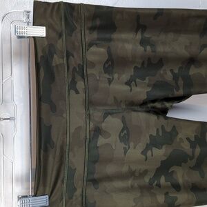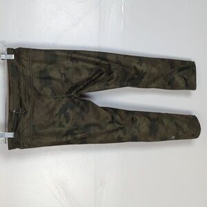 Green camo. Pull on style. Draw cord inside the waistband. Back zip pocket. Excellent condition -- no stains, holes, or fraying. Laid flat waist: 14in. Rise: 8in. Inseam: 21in.