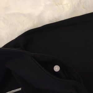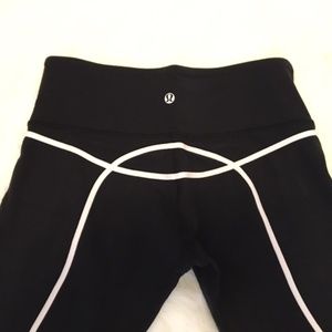 Lululemon capri pants in black with white stripe on the back side of the leg. Size 6. Inner pocket at waist line. Lightly worn with no stains or flaws.