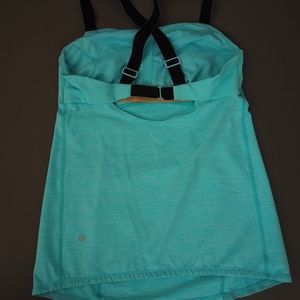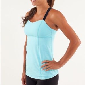 Lululemon Catch Me Tank in size 8. The color is called Angel Blue but has tiny white stripes between the color. It's in mint condition. I've only worn once but I did cut the long tag out in the back. This top comes with a built in sports bra for full support. Black straps are adjustable. If you have any other questions, please don't hesitate to ask.