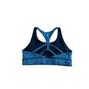This Lululemon sports bra is designed for active women seeking comfort and style. The racerback design provides support and freedom of movement, while the vibrant blue and black pattern adds a fashionable touch to your workout attire. Experience the blend of performance and aesthetics with this high-quality sports bra.