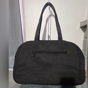 Chic black duffel bag perfect for travel or gym. Sleek and versatile design.