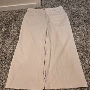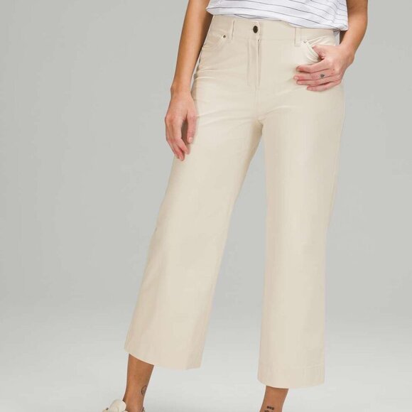 Lululemon City Sleek 5 Pocket Wide Leg High Rise 7/8 pants. These are in the white opal color and a size 33. They measure as follows: waist-36 inches, hips-42 inches, rise-12 inches, and inseam-25 inches.