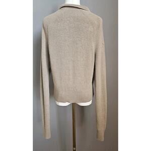 Cozy and stylish Lululemon knit sweater featuring a modern collared neckline with a deep split V design. Made with a luxe merino wool blend for warmth and comfort, this neutral taupe sweater is perfect for layering in cooler weather.