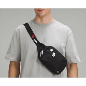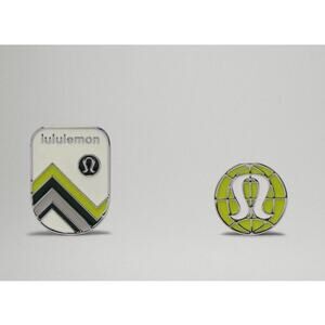 The product is a set of two collectible pins from Lululemon Athletica, featuring their iconic logo and a design of mountains in lime yellow enamel. The pins are in the color green and are original creations by the brand, with a theme centered around accessories. These pins are a retired design, making them a unique and sought-after item for collectors or fans of Lululemon's athletic apparel.