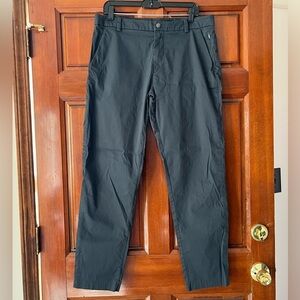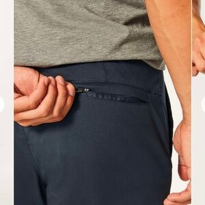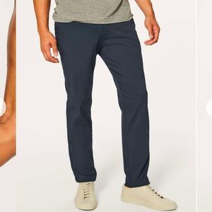 Lululemon men's athleisure pants. Color is dark gray with a blueish hue. Looks like pants have been hemmed at the bottom to 30" (see photo). Gently used, faint dye fading on groin seams and pocket button shown in last photo. No holes or stains.