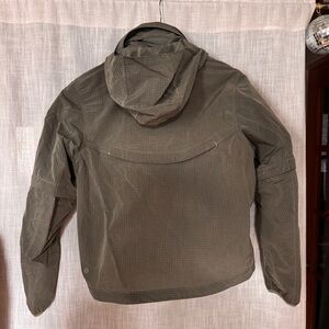 Lightweight olive windbreaker with hood. Features zip closure and pocket details. Ideal for outdoor activities. More info in photos.