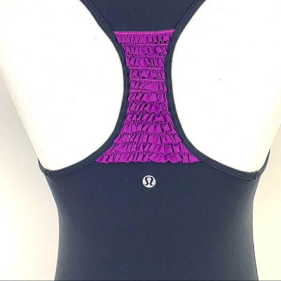 Super cute Lululemon racerback tank with tiny contrasting ruffles on the back. Excellent preloved condition. No flaws that I could see. Color: Coal/Very Violet. No labels at all in this garment. It was ticketed as a size 6. Approximate flat measurements: Length 23.” Armpit to armpit 13.5.”