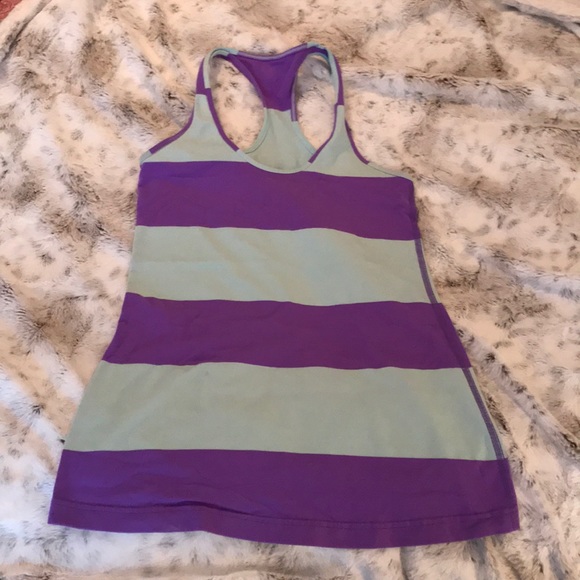 Lululemon racerback tank work a few times. No pilling, snags or stains. I think it is a size 8. Measurements are: 14 inches across the chest. 18 inches across the hip. From armpit to hip it is 20 inches.