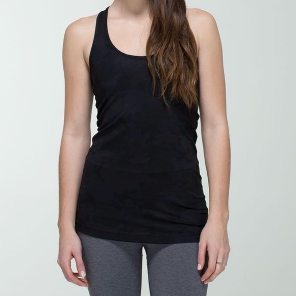 Lululemon Cool Racerback tank in a subtle black-on-black camouflage print. Good used condition. I believe this is a Size 2 — trim fit.