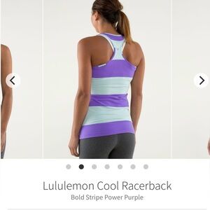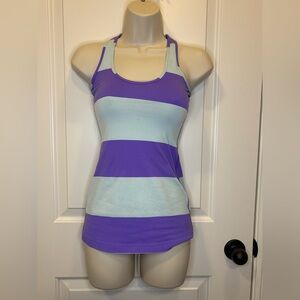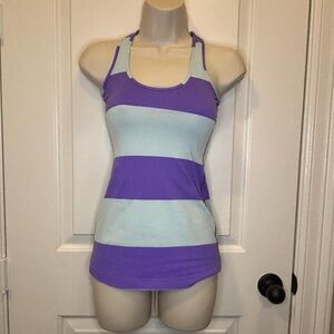 Stylish racerback tank with bold purple and light blue stripes. Perfect for workouts.