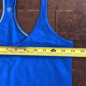 Lululemon Cool Racerback Tank in Porcelain (older release). Size 6. There is no size dot or tag so please see measurements. Not exactly sure if that’s the color but it is a older cool Racerback. Bright Blue with yellow stitching on the inside. In good used condition, does show some signs of wear. I think it is Full Luon material but also unsure, it’s a bit thicker. Non smoking home.