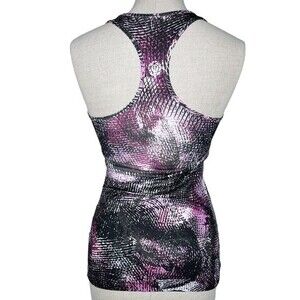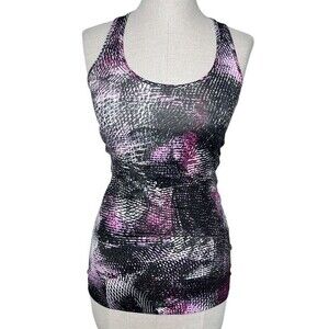 Women's Lululemon Athletica Cool Racerback Tank, size 4. In excellent condition with minimal visible wear! Colorway is Mo Money Light Up Lilac / Black ; graphic print in black, white, and shades of pinky purple. Versatile hip-length tank top designed for a tight fit, perfect for layering. Fabric is Light Luon, which is lightweight, sweat-wicking, and has four-way stretch with a soft and cottony feel. Size tag has been removed, tank measures just shy of 13.5" at armpit level which puts this at a size 4 per the Lulu Fanatics CRB size chart as seen in photos.