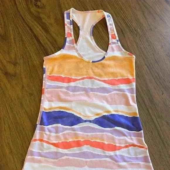 The print is beautiful Bleacher Stripe, an abstract stripe in Grapefruit, Iris Flower, Peach Fuzz, and Pretty Purple on white! This print has colors with a watercolor like variation in color intensity.