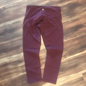 GUC maroon Lululemon crop leggings. No pilling, stains, etc. Not sure what fabric type- more of a sweat wicking.
