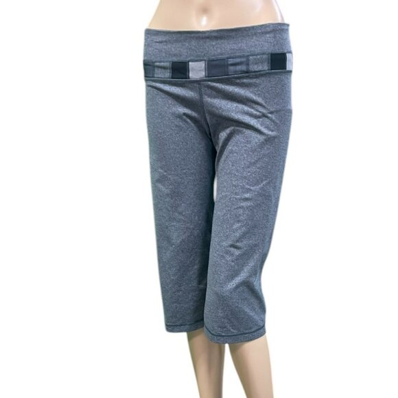 These Lululemon yoga pants are size 8 with a 28" waist. They feature a gray color with a colorblock waist, a flared leg style, and a cropped length of 20". Designed for comfort and stretch, these pull-on pants are ideal for yoga practice.