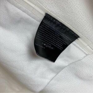 A few spots of discoloration on hood (very hard to see) and the seam taping is peeling inside at the underarms, otherwise very good preowned condition.