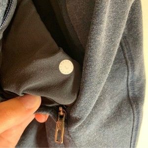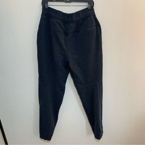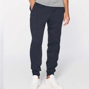 Picturing the Cross Cut Jogger from Lululemon in the color Heathered Inkwell, size L. Zippered pockets, extra soft, internal drawcord, hidden media and coin pockets.