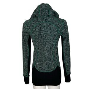 This Lululemon women's Daily Practice Jacket makes a statement due to it’s long sleeve with black trim, thumb holes, zipper front, black ribbed trim, slim fit, hoodie, zip pockets, mid length, logo placement, sweat wicking and green/black chevron like design.