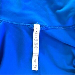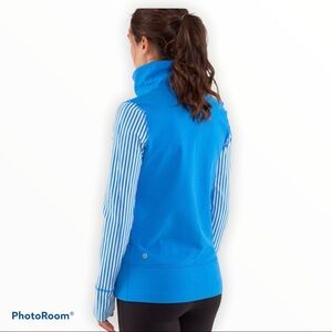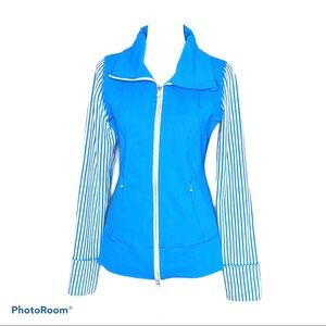 Soft and stylish 'Daily Yoga Jacket' by Lululemon. Luon (nylon/lycra blend) fabric in beaming blue with beaming blue and polar cream stripe sleeves. High collar, full zip with double zipper opening, zip pockets with logo pulls, reflective logo on left back above hem