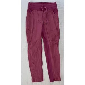 The Lululemon Dance Studio Pants in women's size 6 are versatile activewear pants suitable for various occasions such as travel and different types of physical activities like dance, yoga, or walking. Made from a blended fabric in a maroon color, these pants feature a drawstring closure, elastic waistband for comfort, and a straight leg style with a 27-inch inseam. With a solid pattern and a focus on athletic fit, these track pants also have pockets for convenience. Perfect for all seasons, these machine washable pants from the Lululemon Dance Studio product line are a stylish and functional addition to any woman's wardrobe.