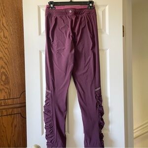 Lululemon athletic leggings, running, performance, outdoor activities, trendy color, burgundy/red wine, adjustable drawstring at the waist, rushed leg details,secured zipper pockets, lined with stretchy fabric. Great preowned condition, gentle used, no flaws.