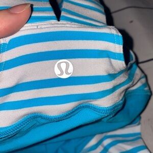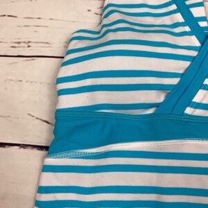 No size tag or size dot. Blue and white stripe pattern. Mesh like material and pocket on the back. v neckline