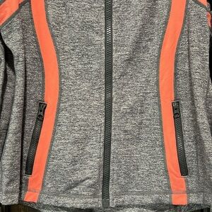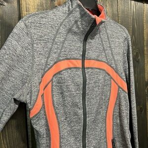 Lululemon Define Jacket. Size 12. Full zip with zipper pockets. Long sleeves. Thumb holes & cuffins. Fitted. Stretch material. Great for running / gym / workouts / yoga or running errands around town. Grey with melon colored trim (pinkish orange). Curved hem. Mock neck. Preloved. Please see all photos for condition. Minor pilling but no holes, stains or major flaws.
