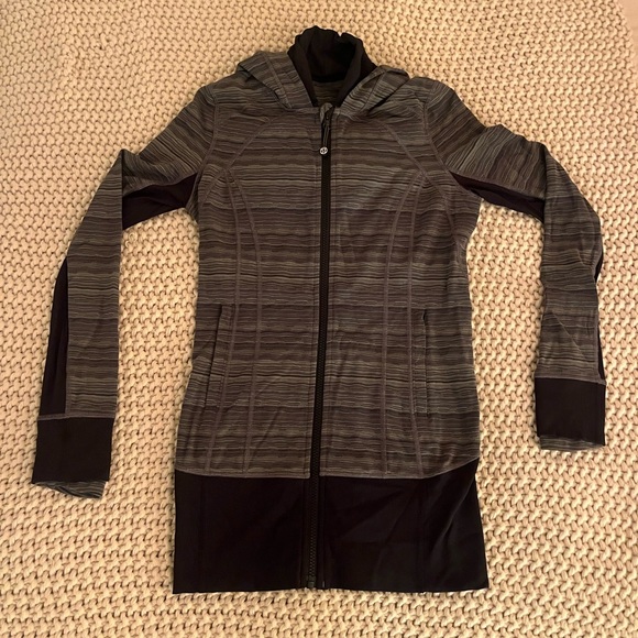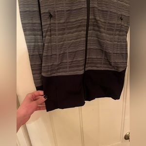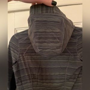 Lululemon Define Jacket with hood, layer of fabric surrounding the neck, finger holes and bottom, for extra coverage.mSize 4. Multicolor green/gray with black.