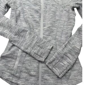 This sleek and form-fitting Define Jacket by Lululemon is perfect for workouts or casual wear. Designed in their signature lightweight, stretchy fabric for ultimate comfort and mobility. Features a full-zip front, two zip pockets, thumbholes, and a back vent detail for breathability.