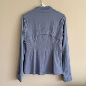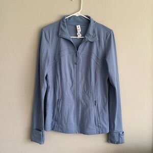 A sleek blue full-zip jacket designed for movement. Lightweight, stretchy fabric with a fitted silhouette. Thumbhole cuffs and zippered pockets for secure storage. Perfect as a layering piece for workouts or everyday wear. Great preowned condition. Size 10