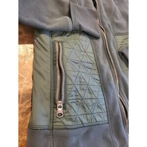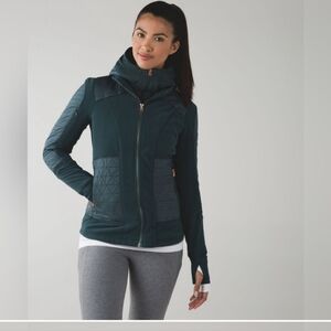 Lululemon full-zip jacket in a sleek design. Features include a high collar, full zip closure, and long sleeves with thumbholes, providing extra coverage and warmth. The fleece body offers a soft and cozy feel, while the quilted panels add textural interest and subtle sophistication. Equipped with zippered pockets, this piece combines practicality with style. Ideal for layering during morning jogs, afternoon errands, or casual evenings out.