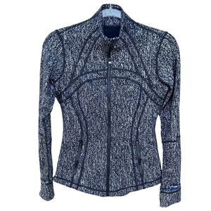 Lululemon OG Define Jacket. Women’s size 6. Style #W4ADRS. Color is Luon Suited Jacquard Black White. The elastic zipper pull is stretched out and no longer lays straight. Besides that, it’s in excellent preowned condition. Always cared for meticulously.
